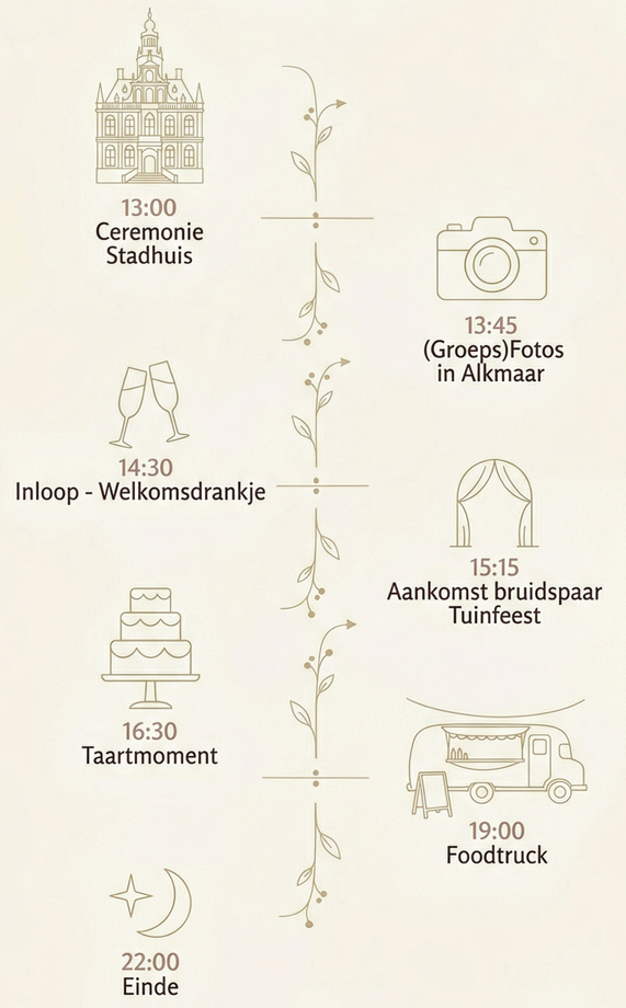 Na de Ceremonie ben je van harte welkom om met ons een feestje te vieren in de tuin! Adres: Sperwer 13, 1722 DK Zuid-Scharwoude.